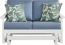 Enhance your patio's seating accommodations with the charming Eastlake glider loveseat. Crafted from highly durable materials, this modern outdoor seat features a slat back and clean lines for a classic silhouette in a versatile white finish. Offering a gentle rocking motion, the glider frame adds soothing movement to the seating experience. Blueberry-colored seat cushions provide ample comfort while a pair of included accent pillows compliment the contemporary style profile.