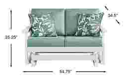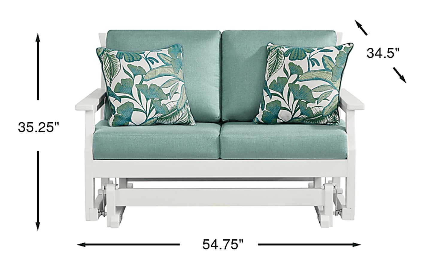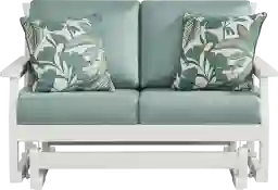 Enhance your patio's seating accommodations with the charming Eastlake glider loveseat. Crafted from highly durable materials, this modern outdoor seat features a slat back and clean lines for a classic silhouette in a versatile white finish. Offering a gentle rocking motion, the glider frame adds soothing movement to the seating experience. Breezy blue-green seat cushions provide ample comfort while a pair of included accent pillows compliment the contemporary style profile.