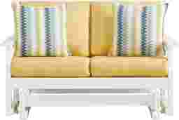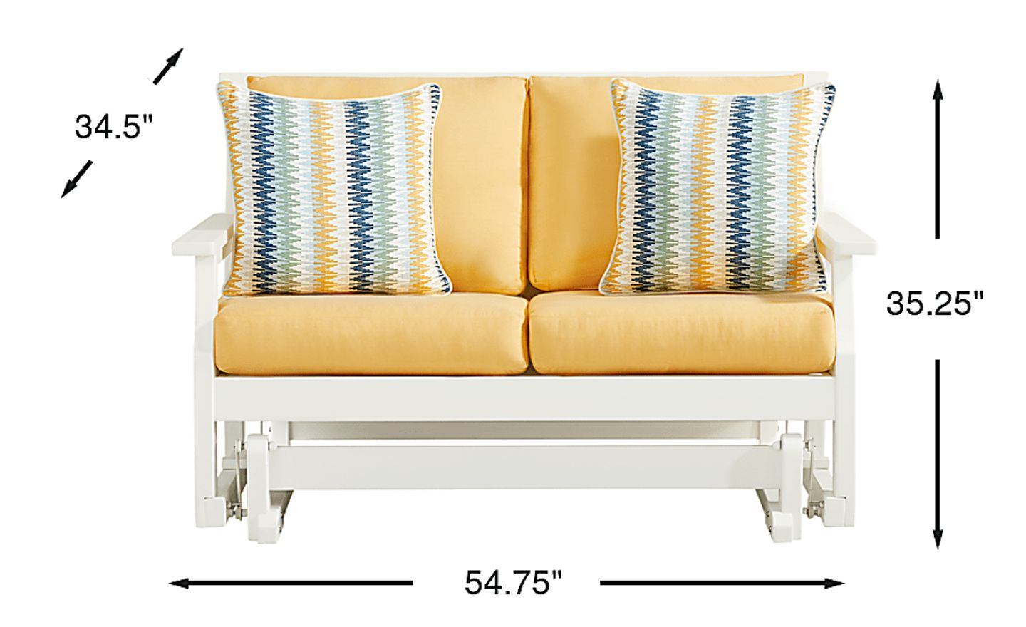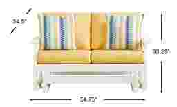 Enhance your patio's seating accommodations with the charming Eastlake glider loveseat. Crafted from highly durable materials, this modern outdoor seat features a slat back and clean lines for a classic silhouette in a versatile white finish. Offering a gentle rocking motion, the glider frame adds soothing movement to the seating experience. Bright buttercup yellow seat cushions in colorfast Sunbrella fabric complete the look with durable outdoor comfort.