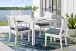 Enhance your outdoor dining space's seating accommodations with the modern Eastlake side chair. Crafted from highly durable outdoor materials, this chair features a slat back and clean lines for a classic silhouette. A versatile white finish offers ample style to enjoy for years to come. Upholstered in a blueberry-colored outdoor fabric, the seat cushion adds UV-resistant color and comfort.