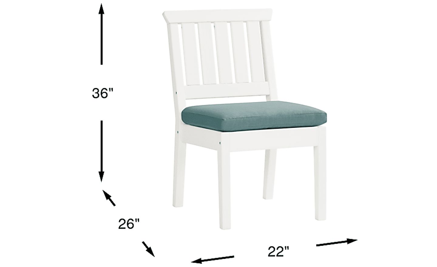 Enhance your outdoor dining space's seating accommodations with the modern Eastlake side chair. Crafted from highly durable outdoor materials, this chair features a slat back and clean lines for a classic silhouette. A versatile white finish offers ample style to enjoy for years to come. Upholstered in a breezy blue green outdoor fabric, the seat cushion adds UV-resistant color and comfort.