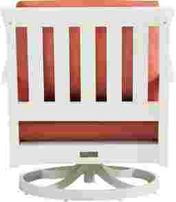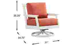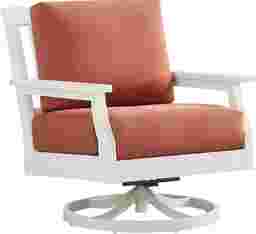 Enhance your outdoor living space's seating accommodations with the modern Eastlake swivel rocker chair. Crafted from highly durable materials, this chair features a slat back and clean lines for a classic silhouette. The seat's swivel base offers swift and easy side to side movement. Bright persimmon-colored seat cushions in colorfast Sunbrella fabric offset the outdoor chair's versatile white finish, offering ample comfort and style to enjoy for years to come.