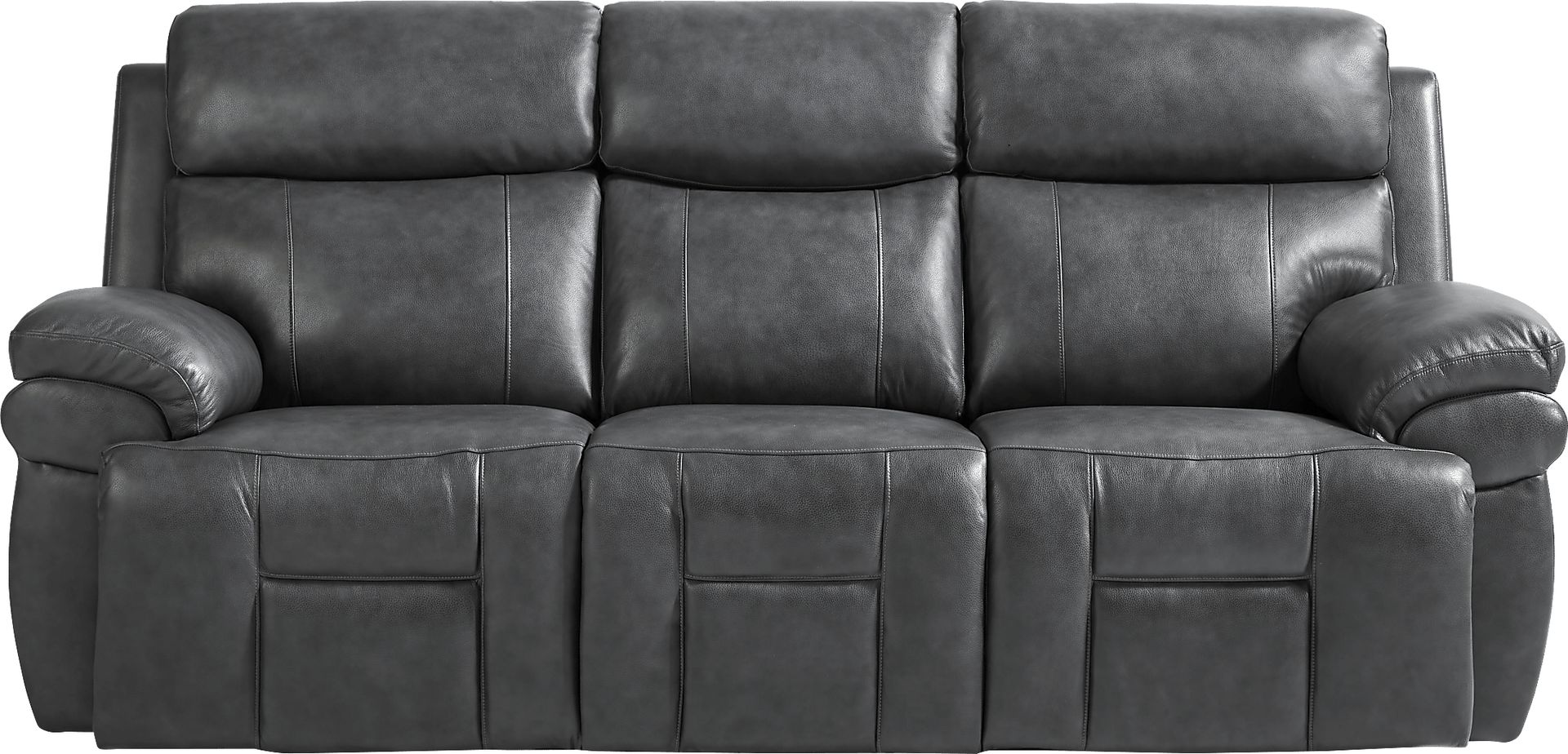 Designed with luxury in mind, the Eastmann reclining sofa brings the gift of comfort to your home. Upholstered in gray top grain leather where the body touches, this sofa offers a cushiony feel you're bound to love. Plush pillowtop arms and padded chaise footrests make this piece an ideal spot for watching television or curling up with a good book. For ultimate relaxation, its triple power reclining function gives you the ability to adjust your headrests, footrests and lumbar supports at the touch of a button. Heated seating, air massage and zero gravity capabilities enhance your comfort. Fitting perfectly in the side pocket, the handheld remote includes a built-in USB port to conveniently charge your devices. Top grain leather where the body touches with vinyl sides and backs.