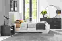 With a soothing ambiance and an undertone of subtle sophistication, the Easton Park bedroom's organic charm evokes tranquility and relaxation. Constructed of poplar wood solids in a black finish, this contemporary room features the luxurious Sydney bed upholstered in a plush white fabric, perfectly complementing the collection's minimalistic aesthetic. The dresser's drawers are highlighted by chic metal bar pulls and include French dovetail construction, dustproof bottoms and full extension glides for support and longevity. Adding a perfectly elegant flair, the round mirror boasts complimenting silver accents that complete your inner sanctuary's new interior design. Mattress and foundation (if required) sold separately. Bed shown is queen size. Bedframe cannot accommodate adjustable foundations.