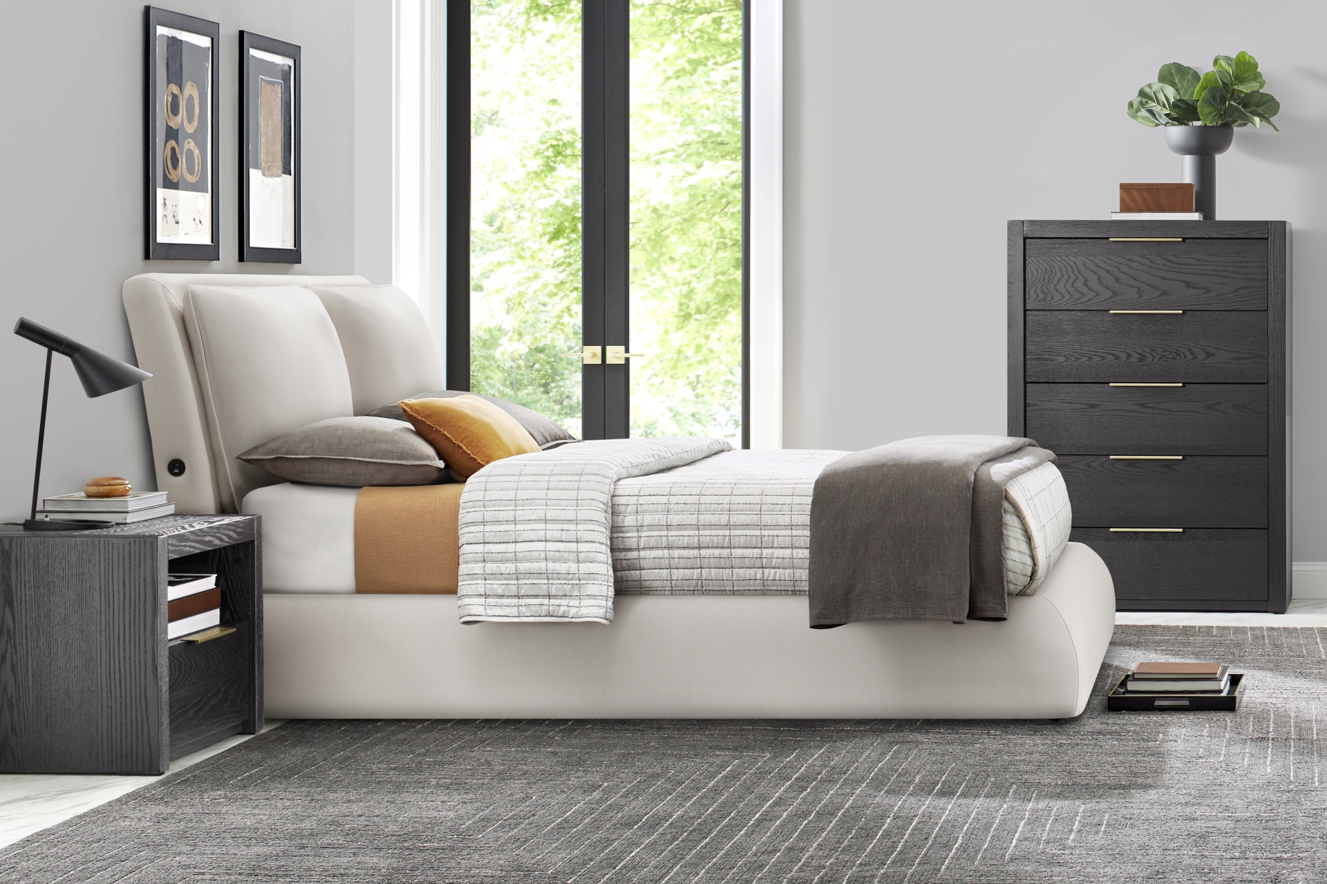 A refreshing and playful style flows through the soft lines and bending curves of the York Mills bed. Fully upholstered in white, this soothing piece features two cushions with welted seams attached to its sloped headboard. The bed's base mirrors the soft accents of the headboard with gentle arcing curves on each side. Convenient USB ports are integrated into the headboard for easy charging.