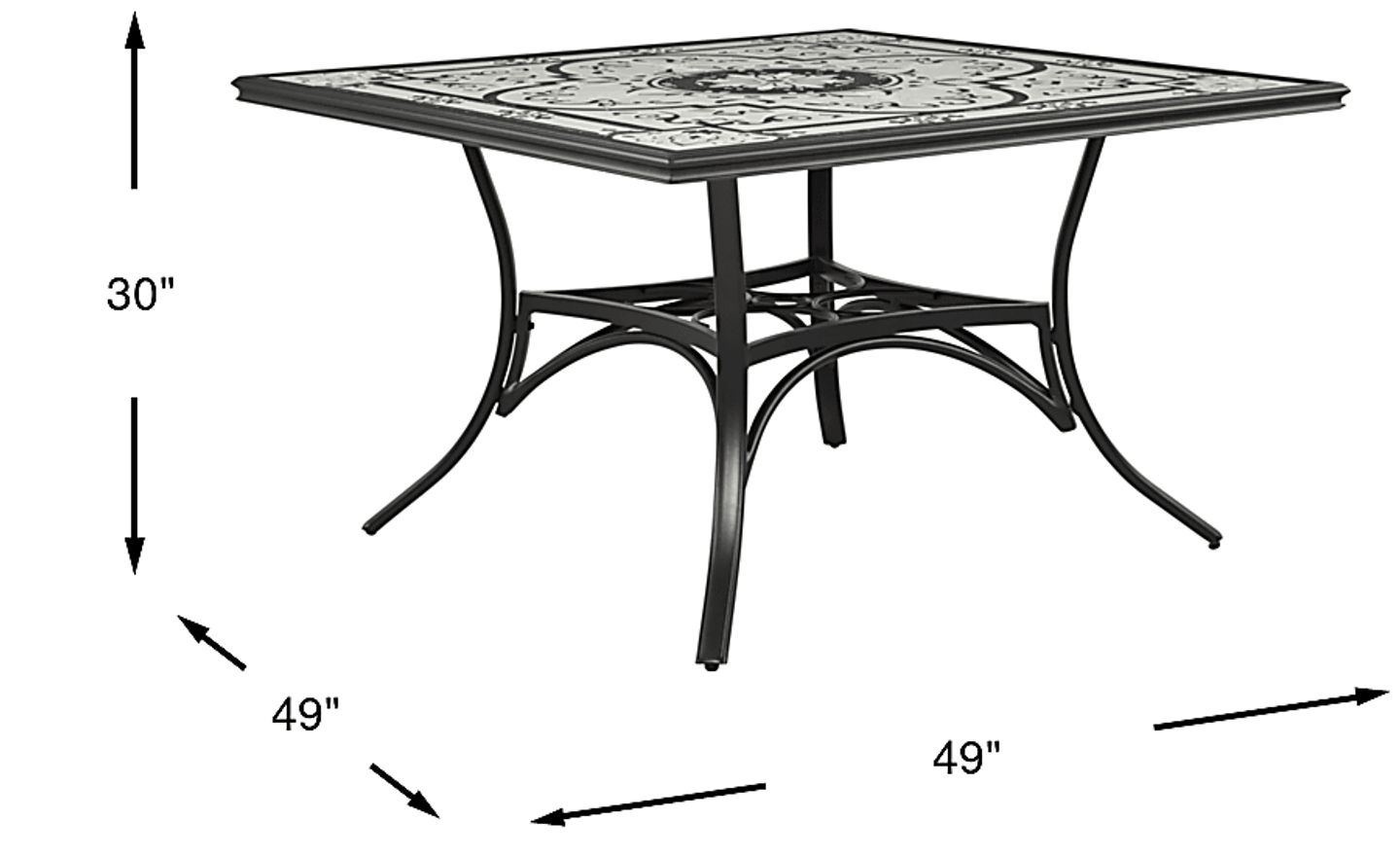 Patio dining becomes a stylish occasion with the Eastvale outdoor dining table. This 49 inch square table boasts a black and white top in an eye catching quatrefoil and medallion pattern. The table, finished in a matte black, is crafted with rustproof aluminum making it ideal for low maintenance outdoor enjoyment.