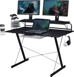 The Eatoheim computer gaming desk with shelving is specifically designed for all your gaming gear so you can focus on that epic battle at hand. Totally equipped for your geekery, this desk features a built-in headphone holder and media storage rack. Do not worry, there is a cup holder for those long sessions. It comes equipped with two elevated monitor stands to fit dual monitors. Customer assembly is required.