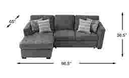 Invite more guests to your home with the Eaton Heights sectional. With extra space for all, this piece is perfect for gatherings, movie nights and more. Contemporary in design, Eaton Heights is accentuated with sleek track arms, tufting detail and denim blue upholstery. Wide seat and back cushions ensure cozy comfort as the storage chaise provides concealed stowing. A convenient combination of sitting and sleeping, this sectional features a hidden pop-up trundle perfect for overnight guests. Multicolored accent pillows complete the look. Upholstery: 100% Polyester