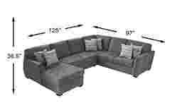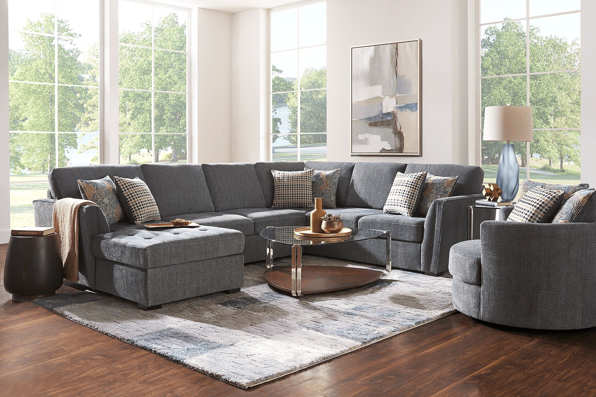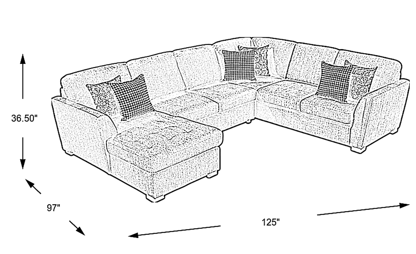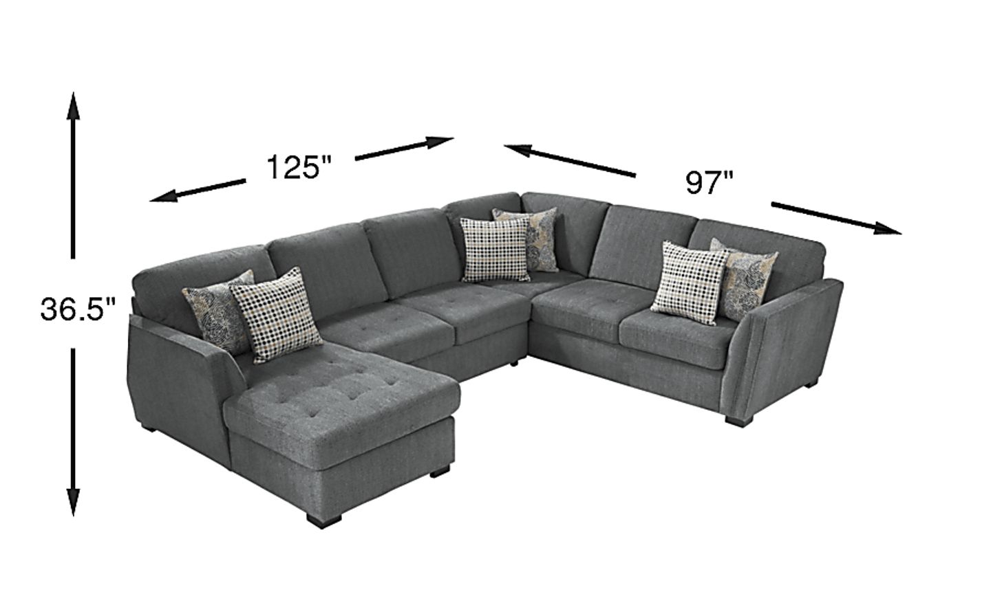 Entertain in style with the Eaton Heights sectional. With extra space for all, this piece is perfect for gatherings, movie nights and more. Contemporary in design, Eaton Heights is accentuated with sleek track arms, tufting detail and denim blue upholstery. Wide seat and back cushions ensure cozy comfort as the storage chaise provides concealed stowing. A convenient combination of sitting and sleeping, this sectional features a hidden pop-up trundle perfect for overnight guests. Multicolored accent pillows complete the look. Upholstery: 100% Polyester