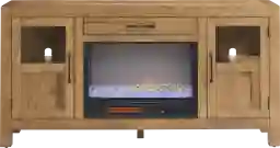 Balanced and versatile with an inviting blend of warmth and elegance, the Edgewater collection is crafted to elevate your home's entertainment center with sophistication and functionality. Transitionally styled with an earthy brown finish, this versatile console features a spacious drawer and two framed glass doors that reveal ample storage space. Below the drawer is an energy-saving LED firebox with remote controlled heat and ambient lighting with four color changing options, keeping your room's ambiance warm and cozy.