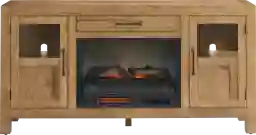 Balanced and versatile with an inviting blend of warmth and elegance, the Edgewater collection is crafted to elevate your home's entertainment center with sophistication and functionality. Transitionally styled with an earthy brown finish, this versatile console features a spacious drawer and two framed glass doors that reveal ample storage space. Below the drawer is a removable log fireplace with flickering flames and faux embers, working with or without heat for a warm ambiance year-round.
