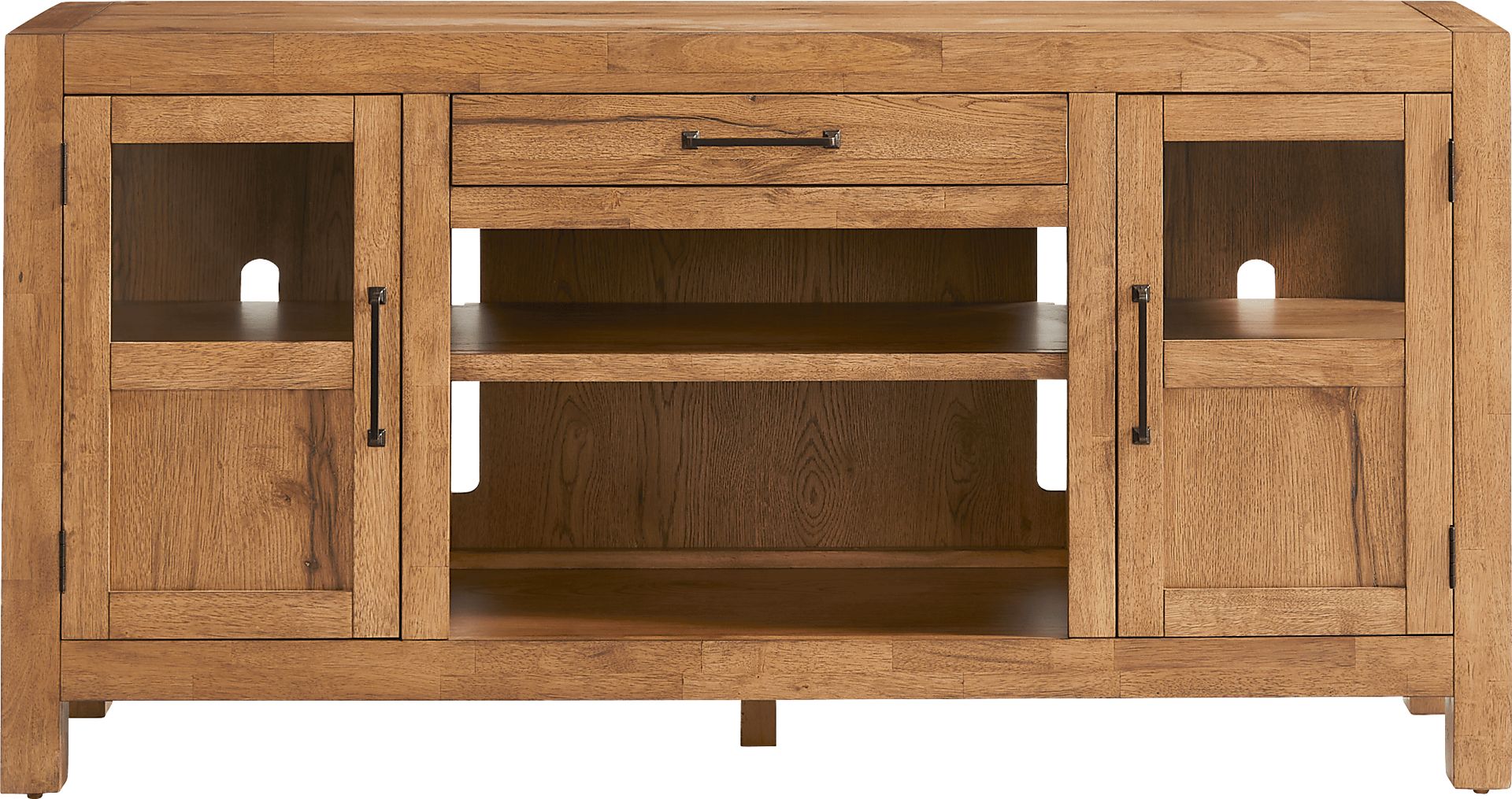 Balanced and versatile with an inviting blend of warmth and elegance, the Edgewater collection is crafted to elevate your home's entertainment center with sophistication and functionality. Transitionally styled with an earthy brown finish, this versatile console easily complements a variety of decorative elements. A spacious drawer and two framed glass doors reveal ample storage space, keeping your entertainment space organized and visually pleasing.