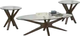 You'll love the contemporary design and sleek look of the Edina table set. Constructed of wood solids with a dark cherry finish, the legs are styled in an intriguing crisscrossed design that will make guests look twice. Each piece is topped with a tempered glass surface.