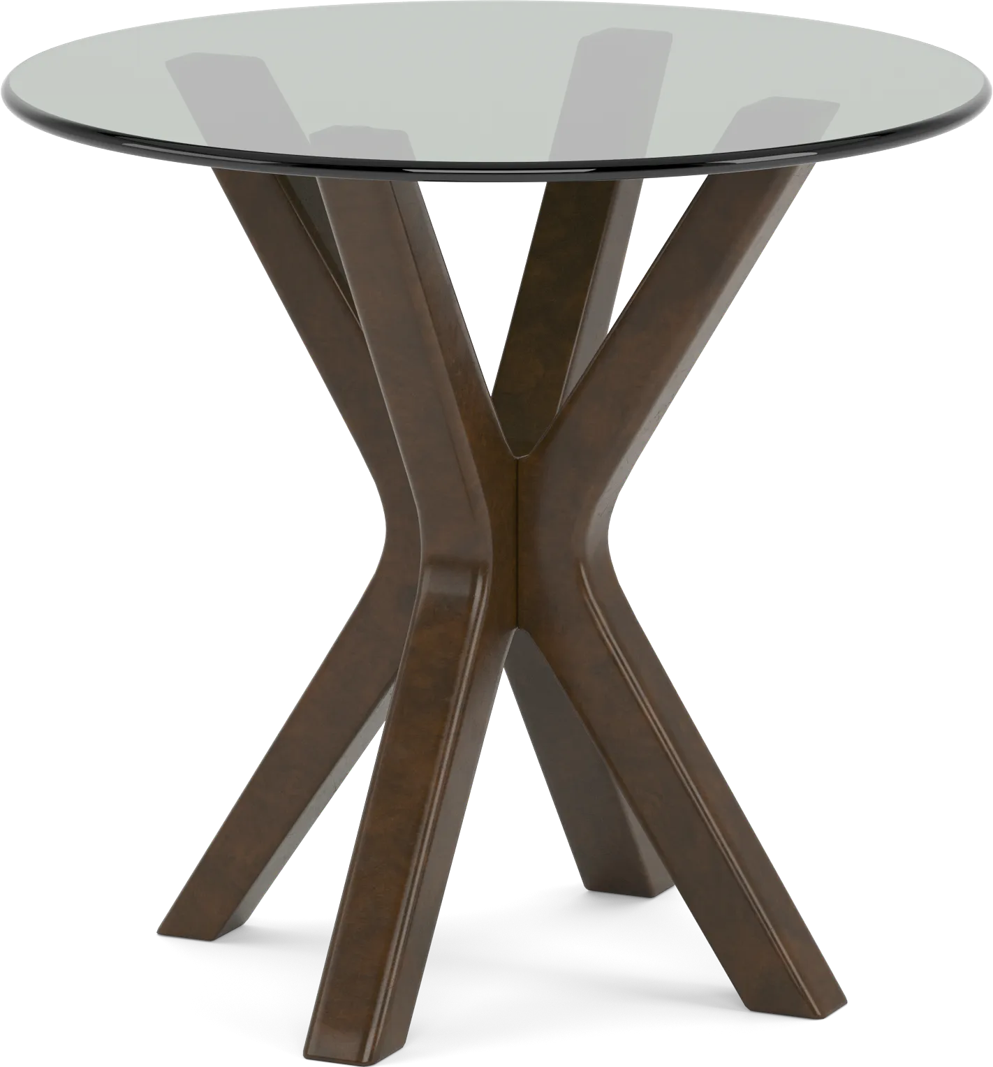 The contemporary design of the Edina end table looks great next to your favorite sofa, loveseat, or chair. Constructed of wood solids with an espresso finish, a round glass top makes a wonderful perch for books or a vase. Intersecting legs add a distinctive architectural element.