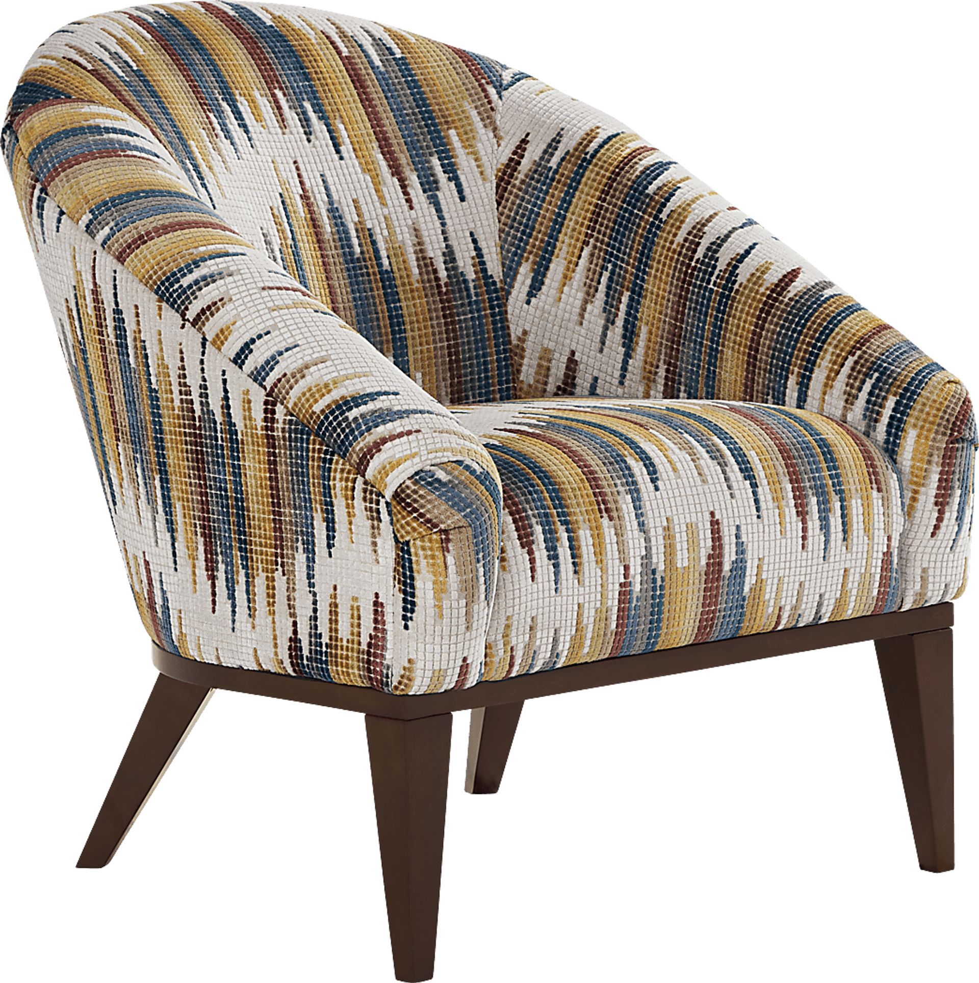 Inspired by mid-century design, the Edison accent chair provides a striking contemporary aesthetic. Upholstered with soft chenille fabric this piece features a curved back and wood base with artfully angled legs in a brown finish. The fabric's pattern boasts allover sophisticated appeal with a vintage-inspired design. Upholstery: 64% Polyester, 36% Viscose.