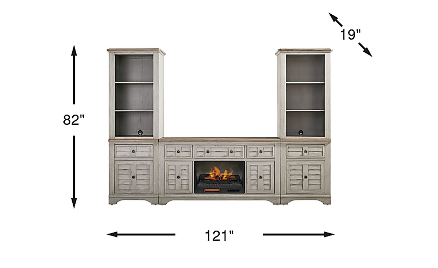 With a total width of 121 inches (over 10 feet), this wall unit is best suited for larger living rooms, open-concept floor plans, or dedicated media rooms. Its substantial height of 82 inches makes it an excellent choice for homes with standard or high ceilings, as it utilizes vertical space to provide storage without the need for additional cabinets. For those in smaller urban spaces, the 64-inch central console can often be purchased individually to provide the same coastal style in a more compact footprint.