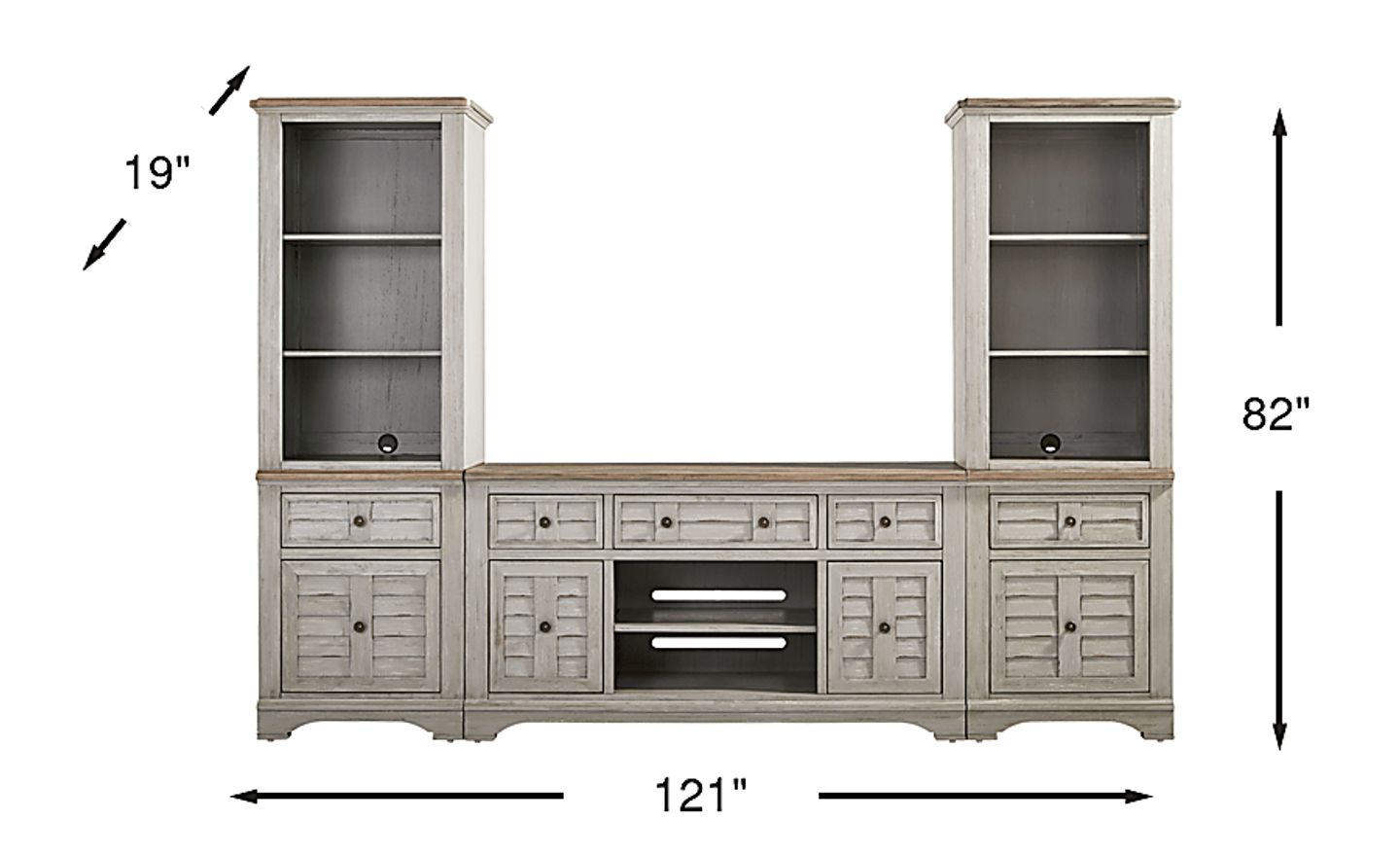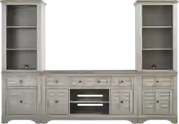 The console features an open shelving system, complete with discreet wire management to keep cords tucked neatly out of sight. The paneled cabinet doors and drawers are designed to conceal everyday essentials with ease, lending the piece both practicality and polish. Flanking piers echo the design of the console, each offering three open shelves above a drawer and cabinet base for versatile storage and display. The look wouldn't be complete without each piece's rich mahogany veneer work and the natural pine veneer tops, a pairing that brings depth, contrast and harmony to the design. Soft gray finish offers the perfect final touch, brightening the set with breezy charm.