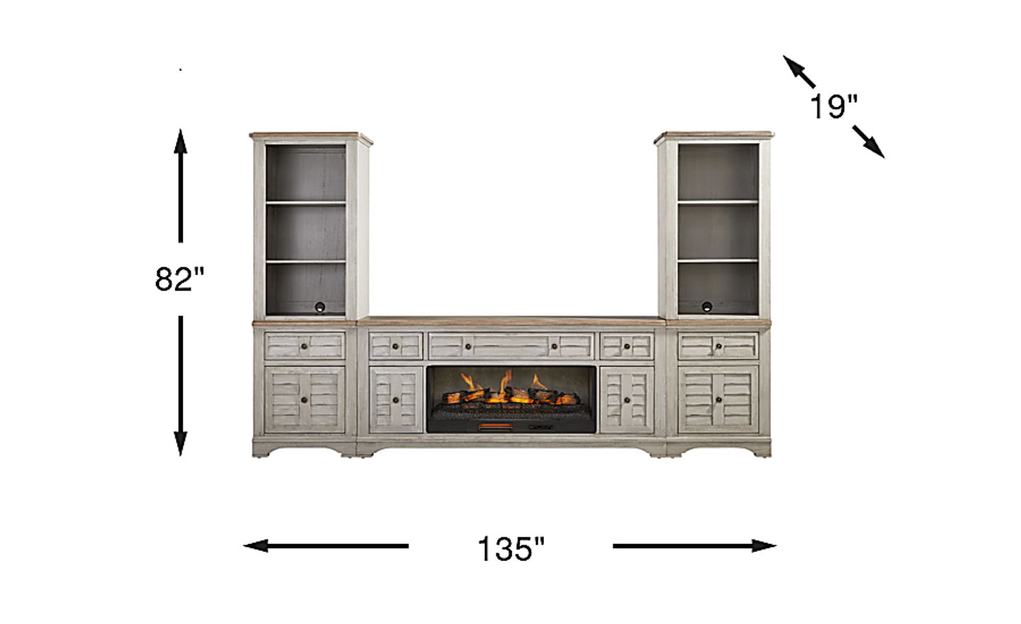 Lending the piece both practicality and polish, this console features paneled cabinet doors and drawers designed to conceal everyday essentials with ease. Adding depth and realism, the electric log fireplace's 3D flame effects can be controlled by a handy remote. The built-in timer can be set anywhere from 30 minutes to 60 hours while the adjustable thermostat ranges from 62 degrees to 82 degrees. Flanking piers echo the design of the console, each offering three open shelves above a drawer and cabinet base for versatile storage and display. The look wouldn't be complete without each piece's rich mahogany veneer work and the natural pine veneer tops, a pairing that brings depth, contrast and harmony to the design. Soft gray finish offers the perfect final touch, brightening the set with breezy charm.