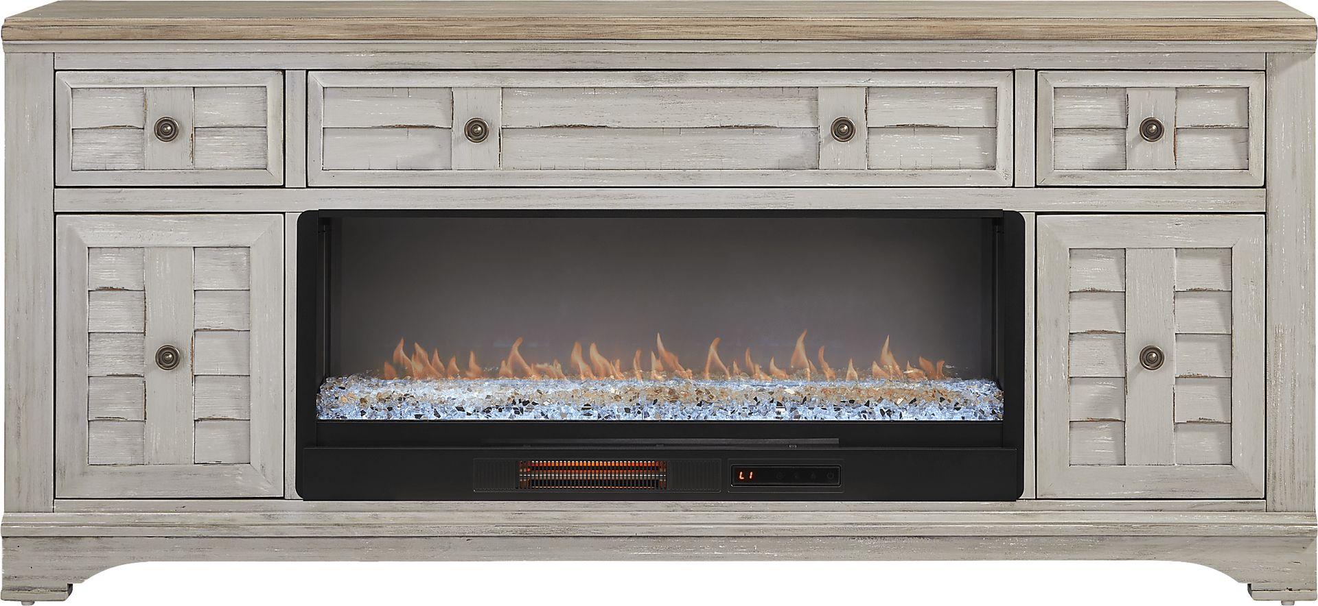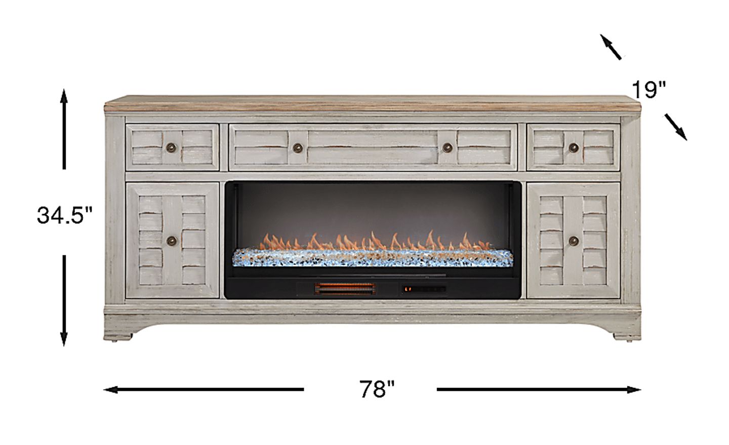 Lending the piece both practicality and polish, this console features paneled cabinet doors and drawers designed to conceal everyday essentials with ease. An energy-saving LED firebox with remote-controlled heat and ambient lighting with four color changing options, helps keep your room warm and cozy. The look wouldn't be complete without the body's rich mahogany veneer work and the top's natural pine veneer, a pairing that brings depth, contrast and harmony to the design. Soft gray finish offers the perfect final touch, brightening the console with breezy charm.
