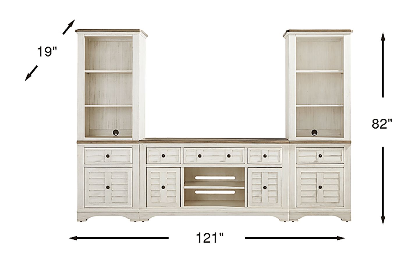 With a total width of 121 inches (just over 10 feet), this 3-piece wall unit is an ideal choice for anchoring a large feature wall or defining an entertainment zone within an open-concept floor plan. The combination of the crisp white finish and the coastal-inspired design ensures that despite its substantial size, the piece adds a bright, airy feel to the room rather than overwhelming it.