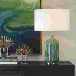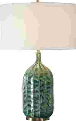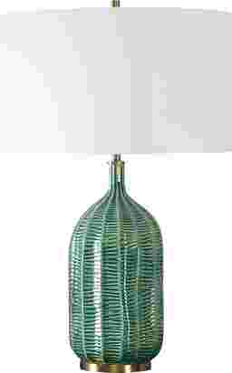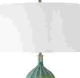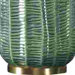 The Edlie Gate Green Lamp is crafted with a ceramic base featuring scalloped channels and an organic striped texture, all bathed in a luxurious hunter green glaze. Enhanced with plated antique brass finishes. The round drum shade is covered in a crisp white linen fabric. Partial assembly may be required.