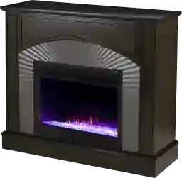 This unit uses shimmering faux crystals and advanced LED technology to offer customizable ambiance. You can cycle through alternating colors to set a specific mood, while the grooved silver surround provides a modern contrast to the traditional crown molding and dark wood finish, making the flames stand out as a central focal point.