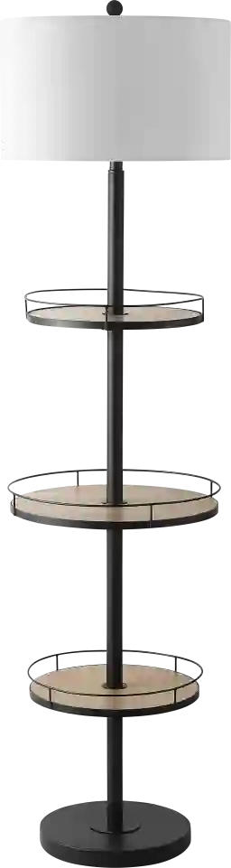Display your trinkets or store remotes, books, and magazines while casting a soft glow in any room with this Edmore Hills Black Floor Lamp. Three circular wood shelves surrounding a matte black stand provide ample storage, its varying sizes add a chic sense of depth to modern decor. Partial assembly may be required.