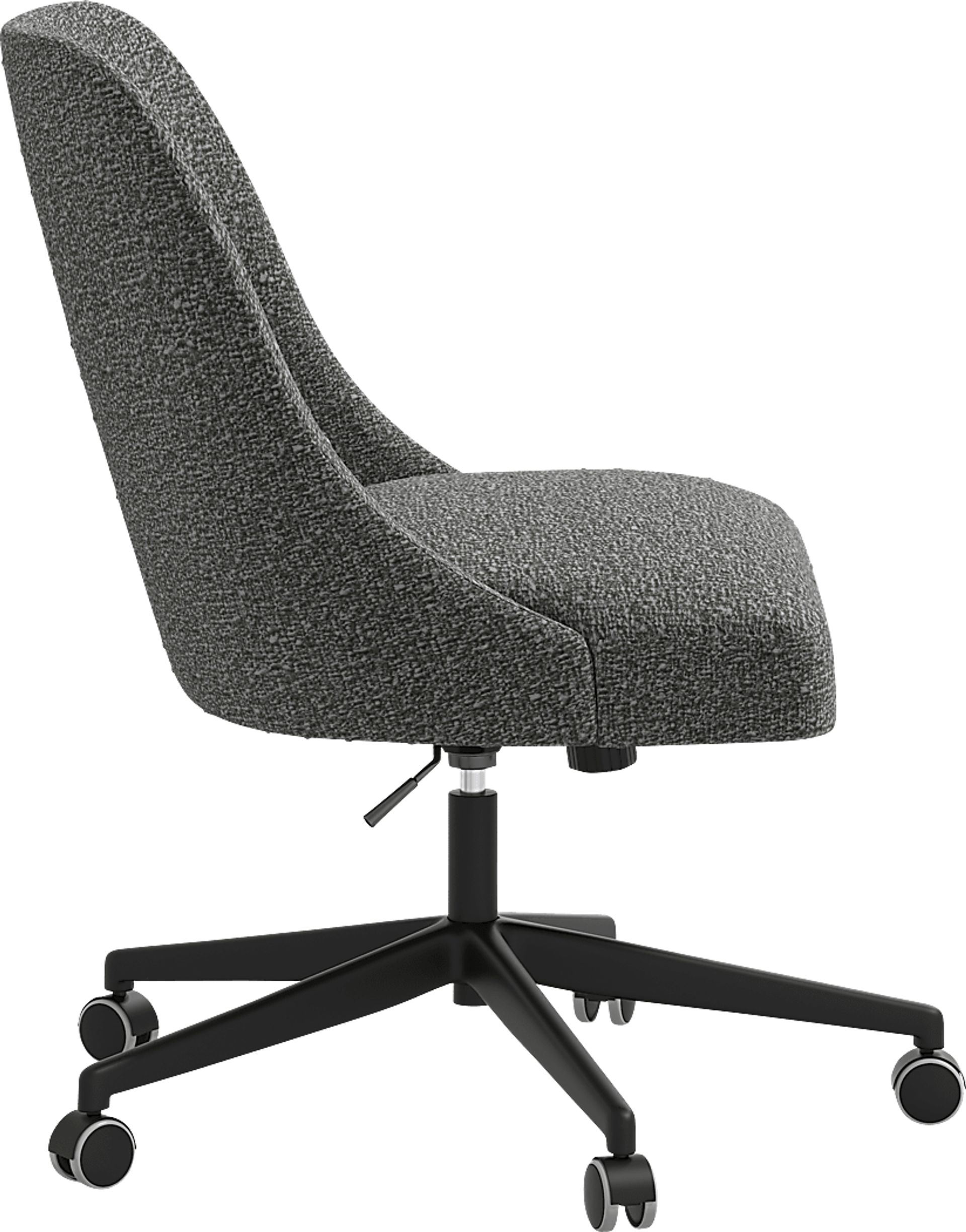 The soft curvature of the Elbe swivel desk chair envelopes the back for incredible comfort. The sleek upholstery and stream-lined shape make it a versatile addition to any office space. It is both sturdy and cushy, with hand upholstered in boucle fabric and a 360-degree swivel mechanism that adjusts for height and features metal casters for ease of movement. This piece is made to order and may take up to 6 weeks to deliver. Customer assembly is required.