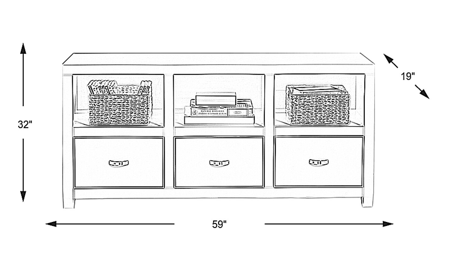The Eldon Square console features urban contemporary style and incorporates sleek lines with scalloped shaping. This stylish piece is constructed from solid wood on the face, veneer exterior side panels and laminate interiors with a fresh white finish. It accommodates most flat panel TVs and includes large fixed shelves for components. Three roomy drawers below are perfect for DVDs, CDs and games. The back panel has cuts out for wire management and ventilation to reduce heat build-up from electronics. Nickel finished drawer pulls add a nice finishing touch.