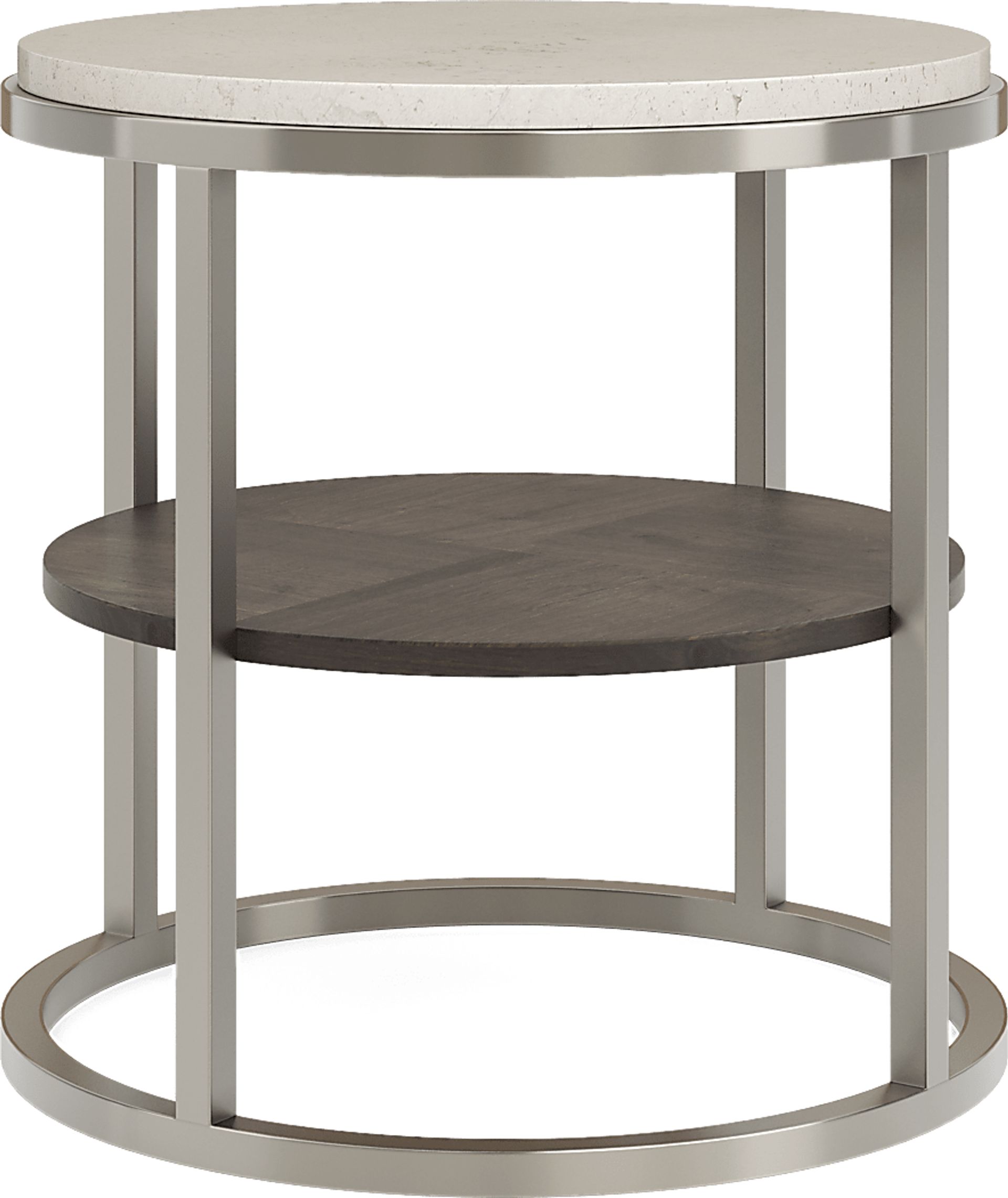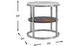 Add style and functionality to your space with the modern Eldren end table. It boasts a beautiful travertine stone 24 inch round top that's perfect for a lamp or decorative accents. The lower shelf is crafted with oak veneers in a rich tobacco finish. Set on a brushed stainless metal frame, this is a stylish choice.