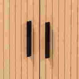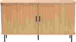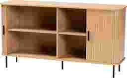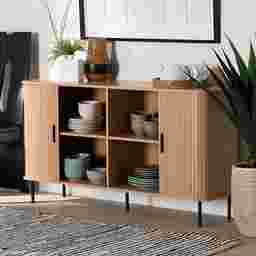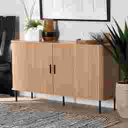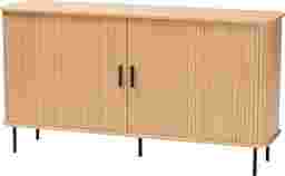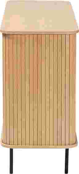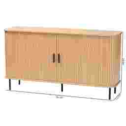 The beauty and functionality of mid-century design arrives in the form of the Eleacoms light brown sideboard. This classic design is comprised of sturdy wood embellished with metal handles for an added touch of sleek industrial flair. Its oval tabletop serves as a fantastic display area while the sliding tambour doors open effortlessly to reveal four shelves perfect for organizing and decluttering busy areas of your home. The Eleacoms features a fluted wood exterior for a textured display rich with artistic presence. Customer assembly is required.