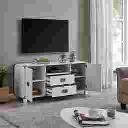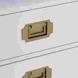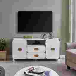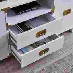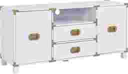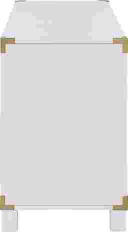 Square off clutter with the easy, classic design of the Elegans media stand. Glam style brass hardware adorns the drawers and corners, contrasting with the sleek white hue. Two drawers in the center conceal smaller items, while the open shelf nestles any media players you need, supplying easy controller access. The side cabinets feature shelving to keep everything extra organized. Create a stylish media center in any room with this chic storage credenza. Customer assembly is required.