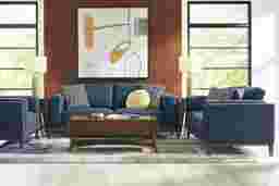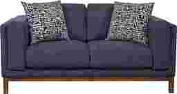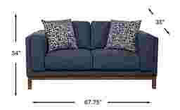 A collected calm settles the moment the Elena Court collection delivers a lived-in ease that feels refined without feeling formal. This transitional loveseat showcases a tailored silhouette and a rich sapphire blue woven fabric that reads warm and grounded. Clean track arms keep the profile crisp and modern, while box-style seat cushions and neatly scaled back cushions create a supportive, lounge-ready sit. The dark brown finished base lifts the frame for a lighter, mid-century-leaning touch that still feels classic. Upholstery: 100% polyester.