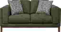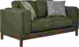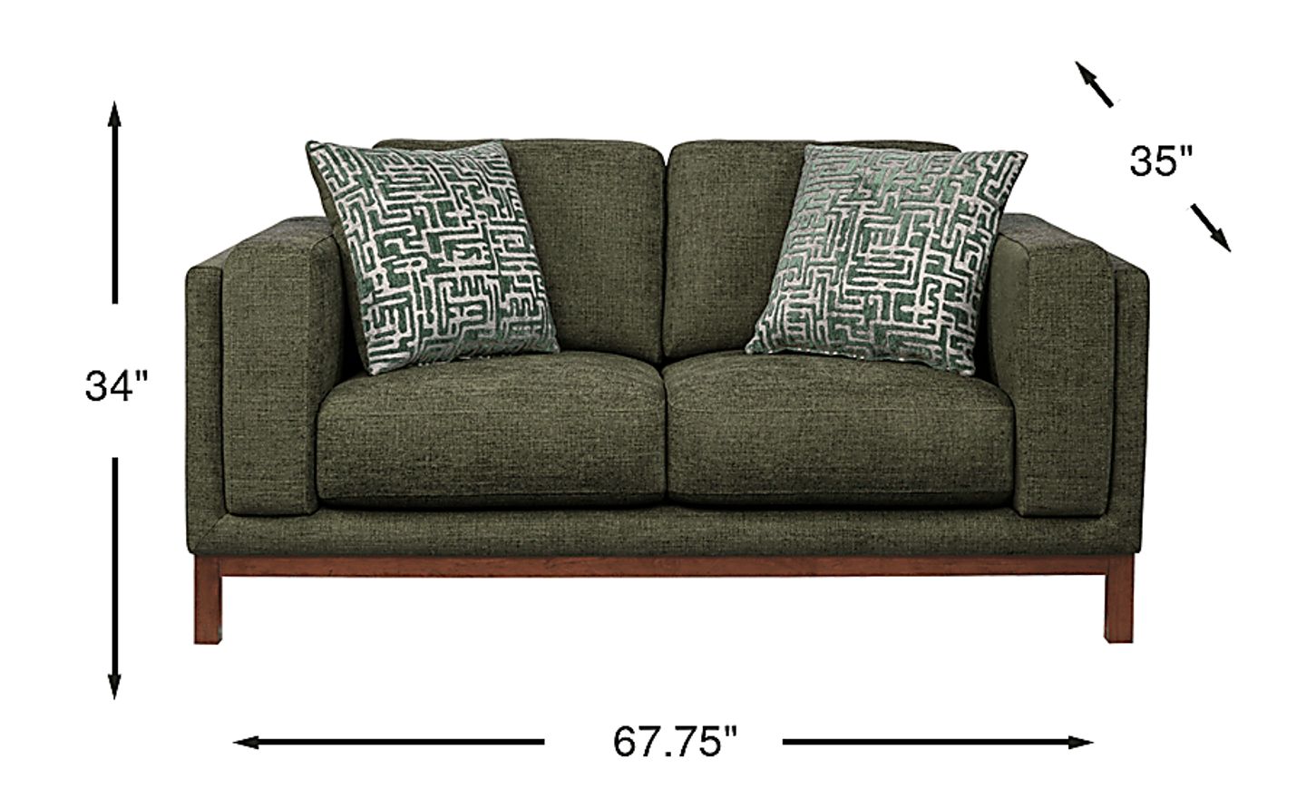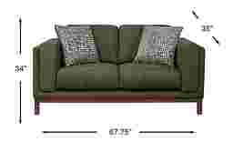 A collected calm settles the moment the Elena Court collection delivers a lived-in ease that feels refined without feeling formal. This transitional loveseat showcases a tailored silhouette and a rich jungle-green woven fabric that reads warm and grounded. Clean track arms keep the profile crisp and modern, while box-style seat cushions and neatly scaled back cushions create a supportive, lounge-ready sit. The dark brown finished base lifts the frame for a lighter, mid-century-leaning touch that still feels classic. Upholstery: 100% polyester.