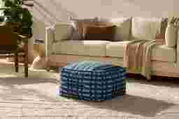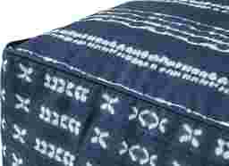 This large Elim floor pouf with a traditional indigo design can be used as an accent piece or extra seating in your living room. The pouf measures 20"W x 20"D x 12"H and is machine-woven of polyester and linen.