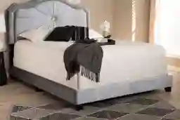 The bed is built with solid rubberwood legs, a hardwood known for its exceptional strength and resistance to warping or cracking over time. The contemporary frame is padded with foam for added comfort, and the design features chrome-finished studs that are securely integrated into the upholstery, ensuring the decorative details remain intact through years of use.