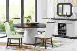 Experience the peak of contemporary luxury and create a truly stunning mealtime experience with the Elko Falls dining room. A round tabletop in a rich espresso finish sits on a commanding pedestal base in white, a ring of gold-colored metal providing the perfect touch of refinement. Soft upholstery and bold, dark outlines in each side chair help create the illusion that they're floating on air - which is exactly how you'll feel when you come home to this set every day. This dining room features a footprint ideal for smaller spaces such as apartments or condos.