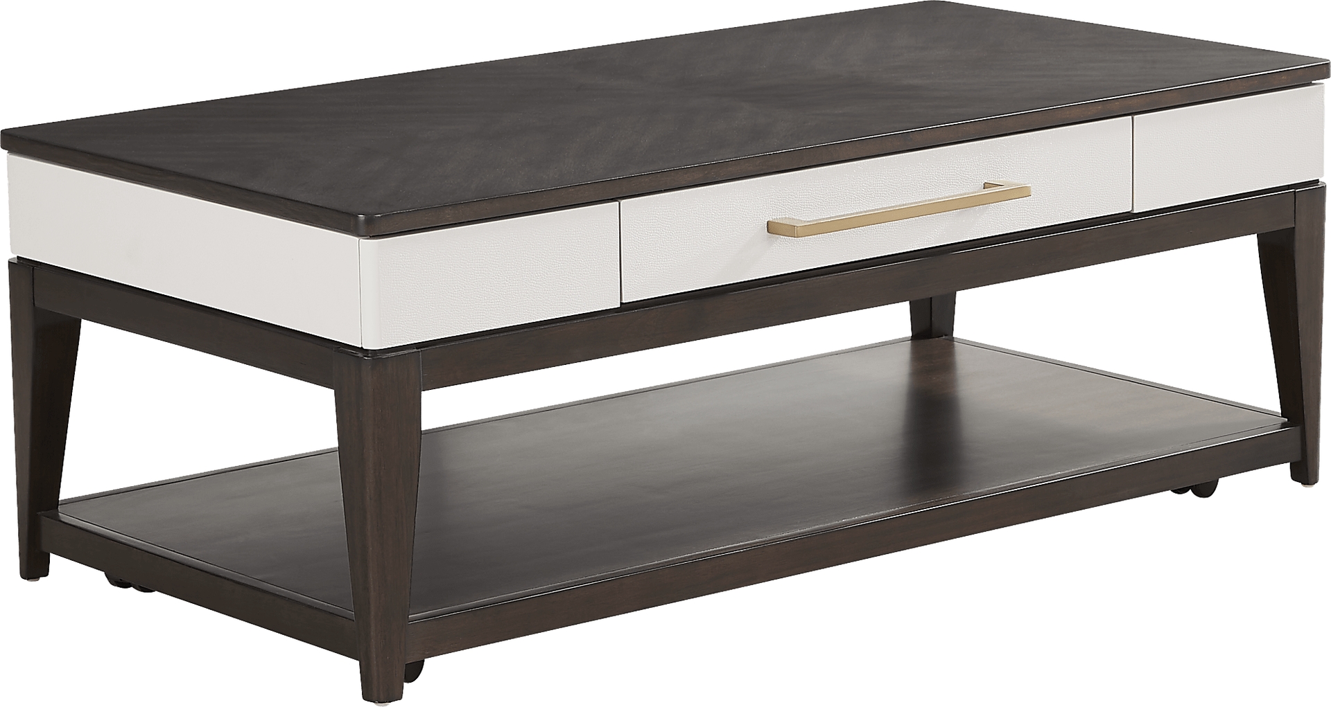 Experience the peak of contemporary luxury and create a truly stunning space with the Elko Falls collection. Featuring a multi-tone approach to contemporary design, this piece has a rectangular tabletop in a rich espresso finish followed by a midsection crafted in a bright white color. The base of the piece puts on a leggy display with tapered feet finished in the same color as the tabletop. The center of the cocktail table is even equipped with a dust proof drawer for easy storage. Completing the look in epic fashion, oversized bar pull hardware is crafted in a brushed gold finish.
