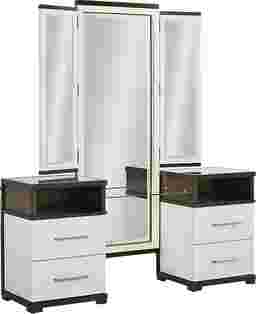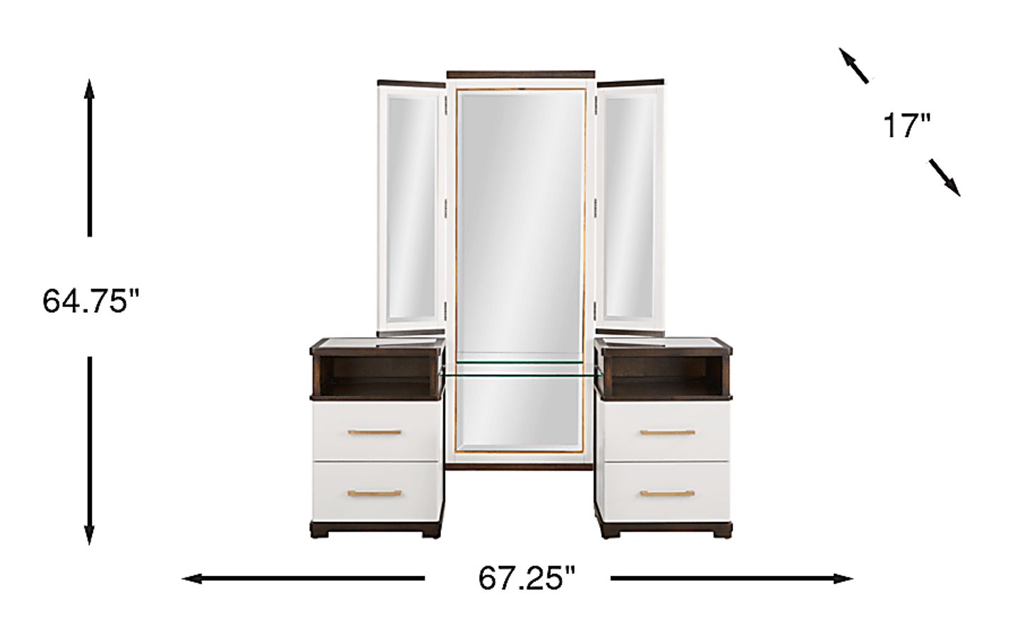Experience the peak of contemporary luxury and create a truly stunning space with the Elko Falls collection. This contemporary vanity set features a tri-fold mirror design with a large center mirror flanked by two hinged side panels for a full-angle view. A sleek glass shelf for everyday essentials connects two bases that provide two crisp white drawers for beauty tools and accessories, while open top cubbies in a rich espresso finish offer easy-access storage. Golden pulls and trim accents add a final glamorous touch.
