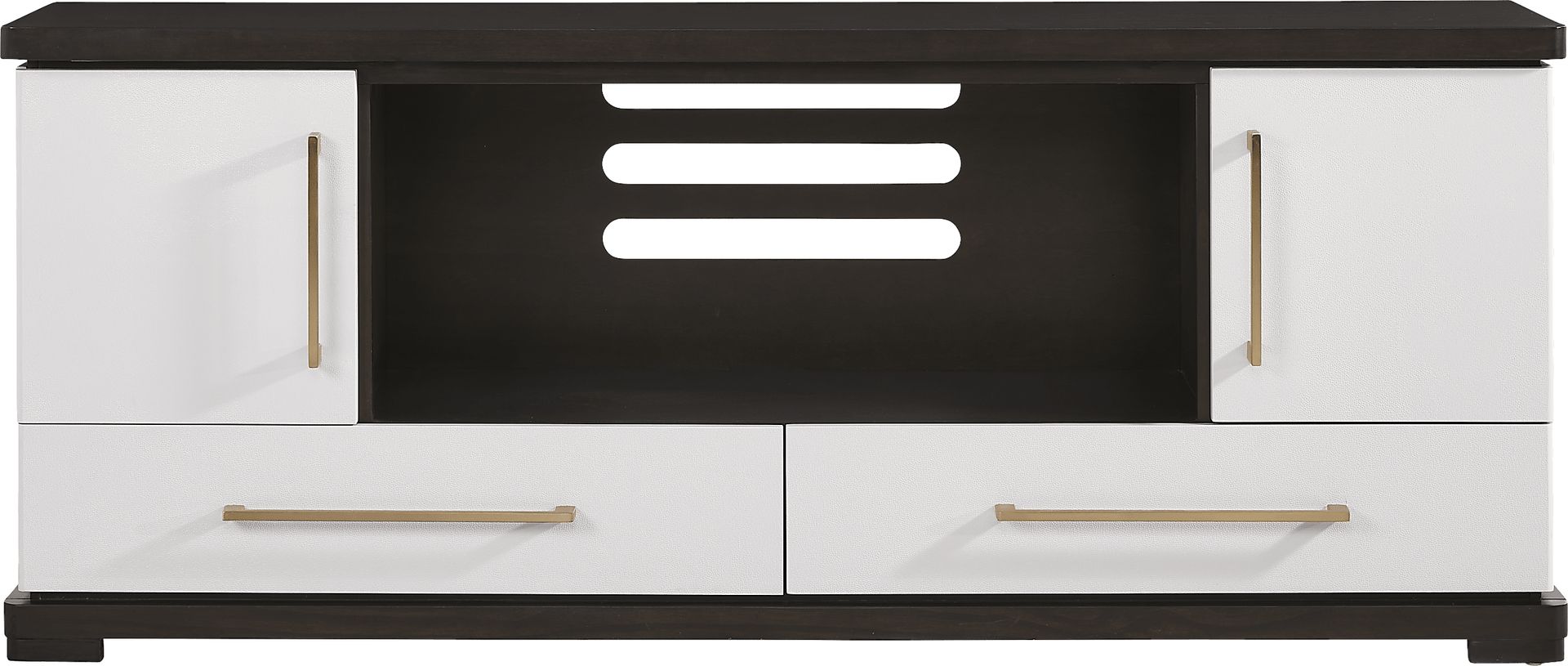 This console offers a high-capacity storage solution featuring two slab-door cabinets and two drawers, alongside a central cubby. This combination allows you to hide clutter like extra controllers and remote manuals behind the elegant gold hardware of the doors, while the drawers provide easy-access storage for smaller items. The central shelf is perfectly positioned for soundbars or frequently used media devices.