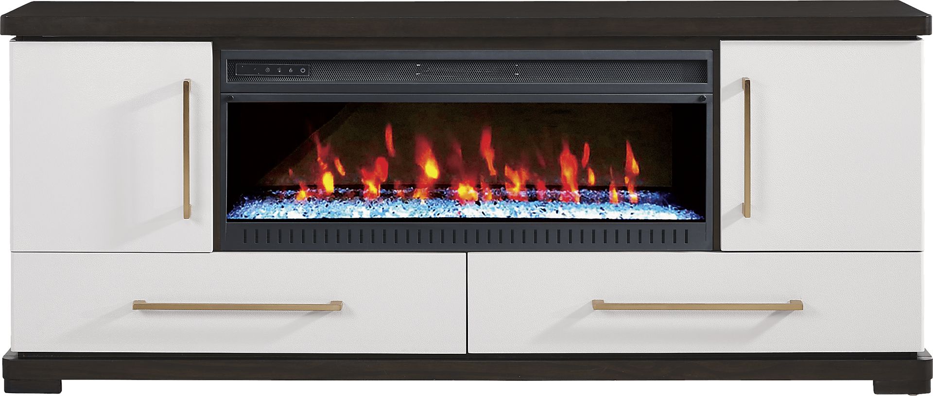 Experience the peak of contemporary luxury and create a truly stunning space with the Elko Falls collection. Featuring a multi-tone approach to contemporary design, the top of this entertainment console is crafted in a rich espresso finish followed by a midsection in a bright white color. The base puts on a leggy display with tapered feet finished in the same color as the tabletop. Two drawers and cabinets provide easy storage, while the energy-saving LED firebox at the center provides remote-controlled heat and ambient lighting. Choose from four color-changing options and create a warm and cozy atmosphere at the touch of a button. The oversized bar pulls in a gold finish on each drawer and door completes the look in epic fashion.