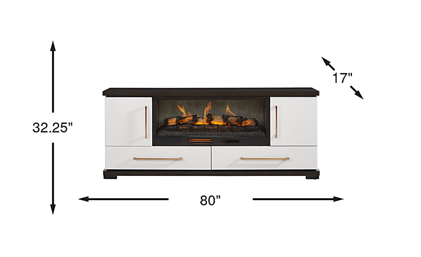 Experience the peak of contemporary luxury and create a truly stunning space with the Elko Falls collection. Featuring a multi-tone approach to contemporary design, the top of this entertainment console is crafted in a rich espresso finish followed by a midsection in a bright white color. The base puts on a leggy display with tapered feet finished in the same color as the tabletop. Two drawers and cabinets provide easy storage, while an electric log fireplace offers both warmth and ambiance. The 3D flame effects can be adjusted with a convenient remote. A built-in timer allows settings from 30 minutes to 60 hours. The adjustable thermostat ranges from 62 to 82 degrees for personalized comfort. Oversized bar pulls in a gold finish on each drawer and door completes the look in epic fashion.