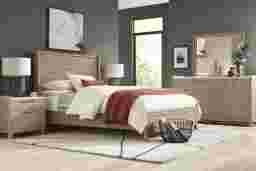 Bringing a fresh meditation on the endless appeal of organic patterns and sensibilities, the Ellenbrook bedroom skillfully plays nature-inspired beauty against exacting angles to breathtaking effect. A headboard and footboard with alternating high-low panels showcase woodgrain designs in a brown finish, poised on a set of tapered legs. The matching dresser includes elongated metal bar pull hardware, a cabinet with three shelves and a marble-patterned top to heighten the contemporary style. The included mirror can be mounted to the dresser to complete the look. Mattress and foundation (if required) sold separately.