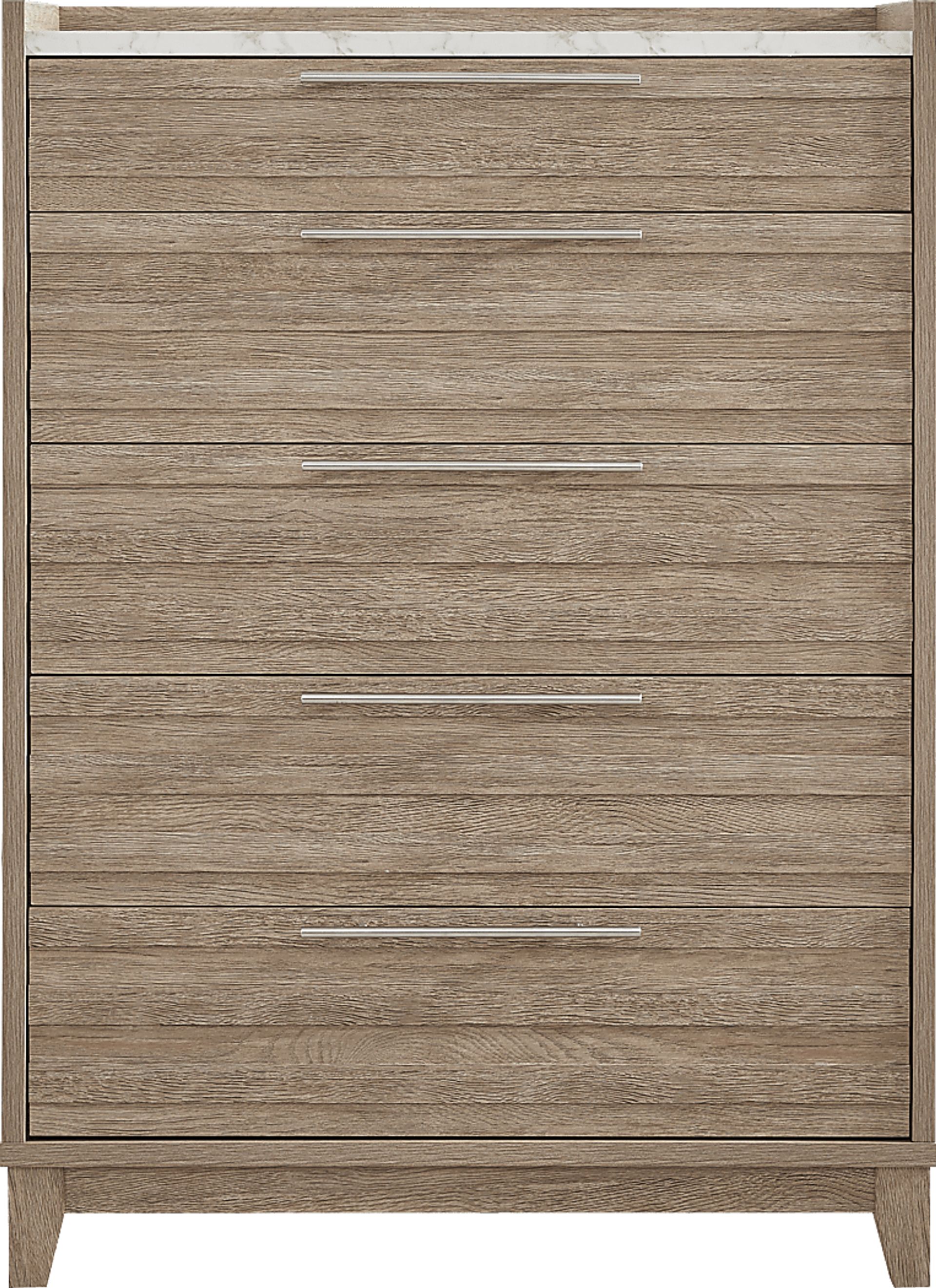 Bringing a fresh meditation on the endless appeal of organic patterns and sensibilities, the Ellenbrook chest skillfully plays nature-inspired beauty against exacting angles to breathtaking effect. This accent showcases woodgrain designs in a brown finish while elongated metal bar pull hardware and a marble-patterned top heightens the contemporary style.