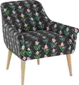 Invest in a custom made accent chair that is thoughtfully executed and extremely well crafted. Uncomplicated in appearance yet well made and attractive, this mid-century modern chair is a delight to behold and features a roll back arm design. This piece offers a sturdy frame and tapered wooden legs that speak to smart functional design. A carefully stretched covering of beautiful floral finishes the overall look, and the piece is completely hand upholstered-with attention given to every last detail. Customer assembly is required. This piece is made to order and may take up to 6 weeks to deliver.