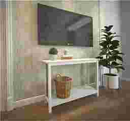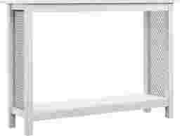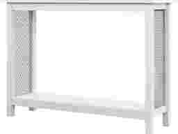 A streamline and visually enticing wood and iron sofa table grounds your living room in a rustic industrial style. The rectangular tabletop frame and lower shelf offer organic character grain patterns and texture while the iron perforated sides add a very special touch. The lower shelf provides extra storage for magazines books plants decor and more. It is constructed of durable materials and assembles quickly and easily. Customer assembly required.