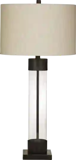 The Elmodel table lamp's base is transparent and cylindrical, revealing the inner bronze rod, providing any space with a simple-rustic feel. Some customer assembly required.