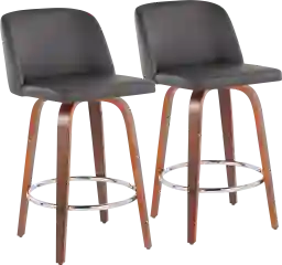These stools embody mid-century modern simplicity through their tapered wood legs with a rich walnut finish and clean, square seat lines. The addition of a circular chrome footrest provides a contemporary metallic accent while adding structural stability and a comfortable place to rest your feet.