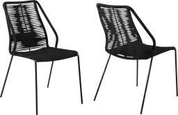 The set of 2 Elorian indoor/outdoor steel dining chair with black rope are the epitome of comfort and dependability. The Elorian outdoor dining chairs come in a set of two, perfect for mixing and matching to create your ideal preferred outdoor atmosphere. The intricately woven rope featured on the durable metal frame form to offer you extreme comfort and relaxation. This outdoor chair is wrapped in resilient regatta rope cording, providing supple support while still allowing for element passthrough, also enhancing your seating experience with a softness that rivals most fabrics. Each chair is made with the best craftsmanship, with these chairs standing on top of durable metal legs in a black finish for a modern look. For use indoors and out, the soft UV coated nylon cords are hand dyed resulting in subtle tonal variations. Customer assembly is required.