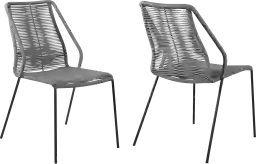 The set of 2 Elorian indoor/outdoor steel dining chair with gray rope are the epitome of comfort and dependability. The Elorian outdoor dining chairs come in a set of two, perfect for mixing and matching to create your ideal preferred outdoor atmosphere. The intricately woven rope featured on the durable metal frame form to offer you extreme comfort and relaxation. This outdoor chair is wrapped in resilient regatta rope cording, providing supple support while still allowing for element passthrough, also enhancing your seating experience with a softness that rivals most fabrics. Each chair is made with the best craftsmanship, with these chairs standing on top of durable metal legs in a black finish for a modern look. For use indoors and out, the soft UV coated nylon cords are hand dyed resulting in subtle tonal variations. Customer assembly is required.